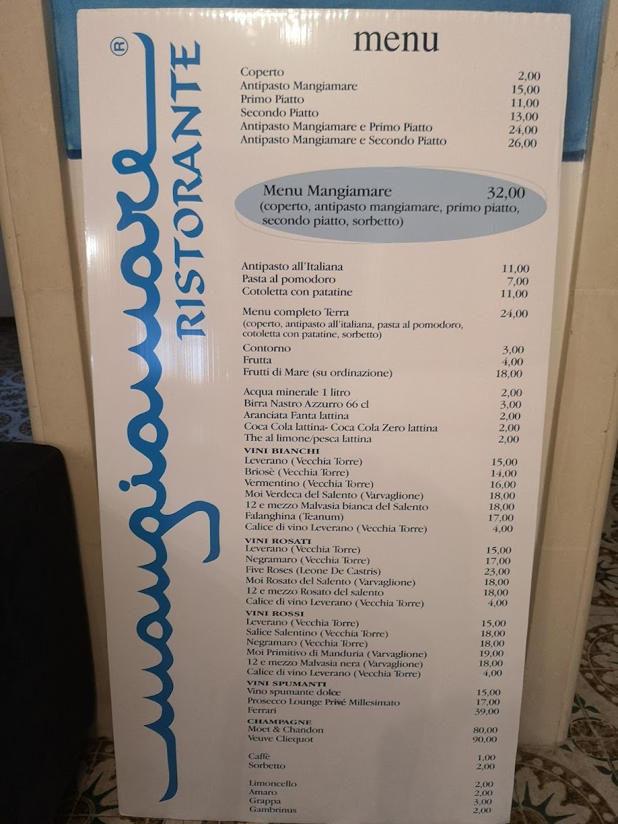 Welcome to Mangiamare, a premier seafood destination located on the stunning coast of Santa Maria di Leuca, Italy. This restaurant is celebrated for its varied and fresh seafood offerings, highlighted by a fixed five-course menu priced at an astonishingly reasonable €35. The culinary experience begins with an extensive antipasto selection, featuring flavors that transport your taste buds to the Mediterranean.